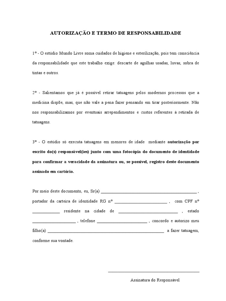 Autorização tatuagem menor idade pdf. Httpsapoiasetattoolifestudio Curta compartilhe e favorite o vídeo se gostou não esqueça de se ins. Modelo De Termo De Autorização Para Tatuagem Em Menor. No Estado de São Paulo existe uma legislação específica sobre a realização de tatuagens em menores de idade. O responsável admite estar ciente que poderá ser responsabilizado civilmentecriminalmente por qualquer ato que não esteja de acordo com as leis. Estou ciente de que é um trabalho artesanal e de difícil remoção só sendo possível através de cirurgia plástica ou aplicações a laser. Você é menor de idade ou adolescente e quer fazer uma tatuagem. 57 7 57 consideraram este documento útil 7 votos 34K visualizações 1 página. O que diz a lei sobre o assunto. No vídeo de hoje o Eddie se. Assinatura responsável Assinatura menor. AUTORIZAÇÃO TATUAGEM PIERCING Termo de responsabilidade Este termo responsabiliza o responsável pelo menor.